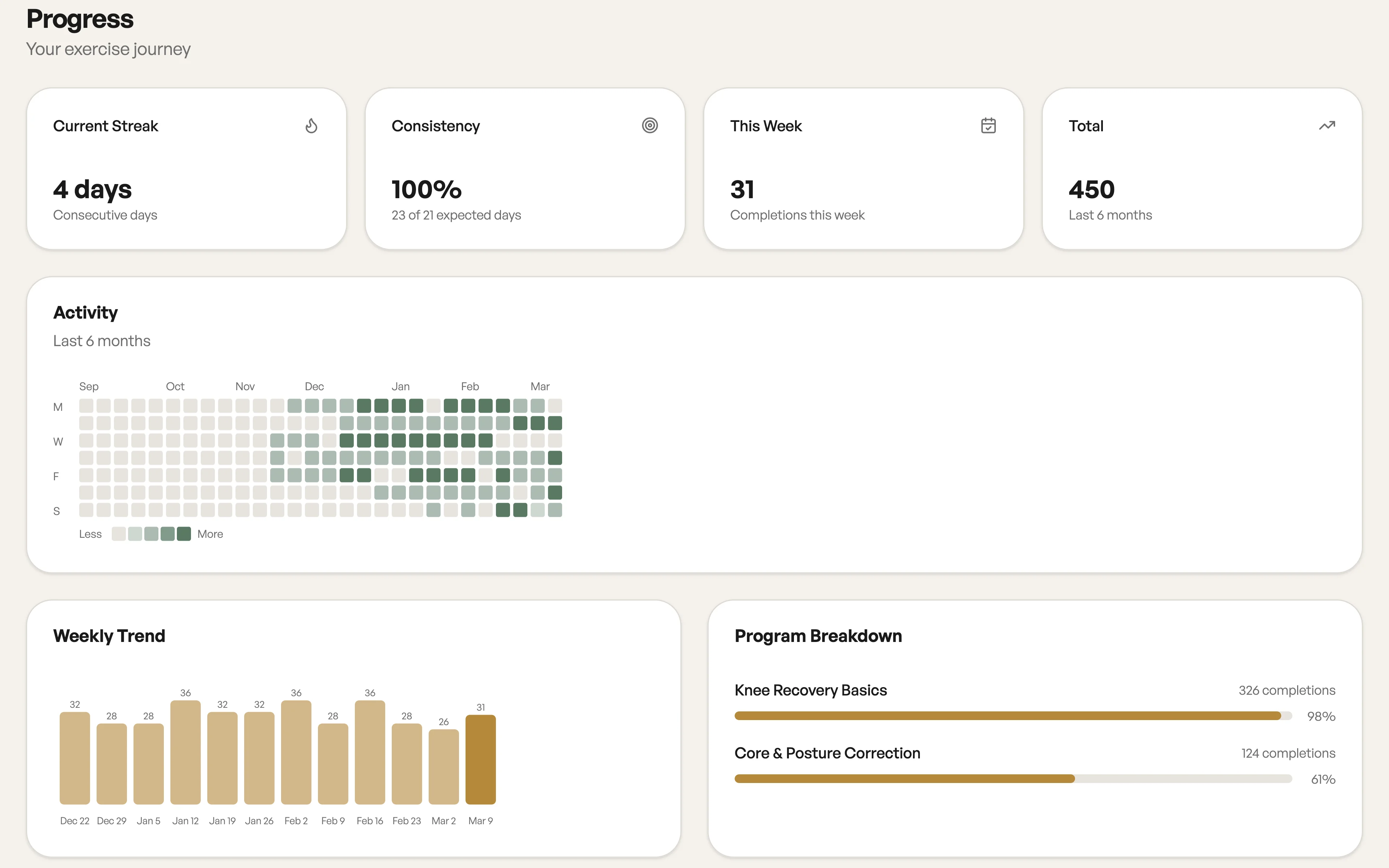 Streaks, heatmaps, and weekly trends keep patients motivated and providers informed.