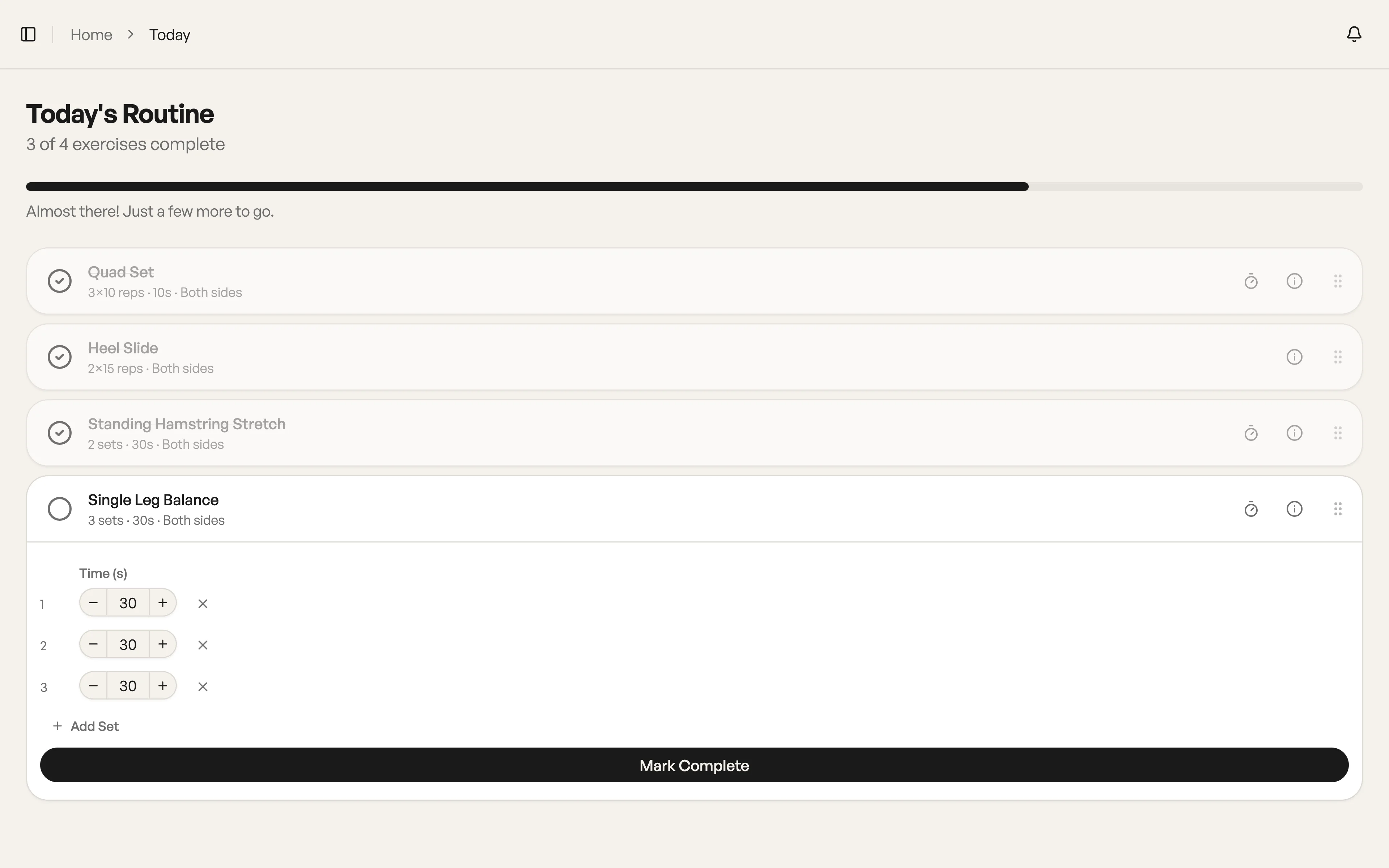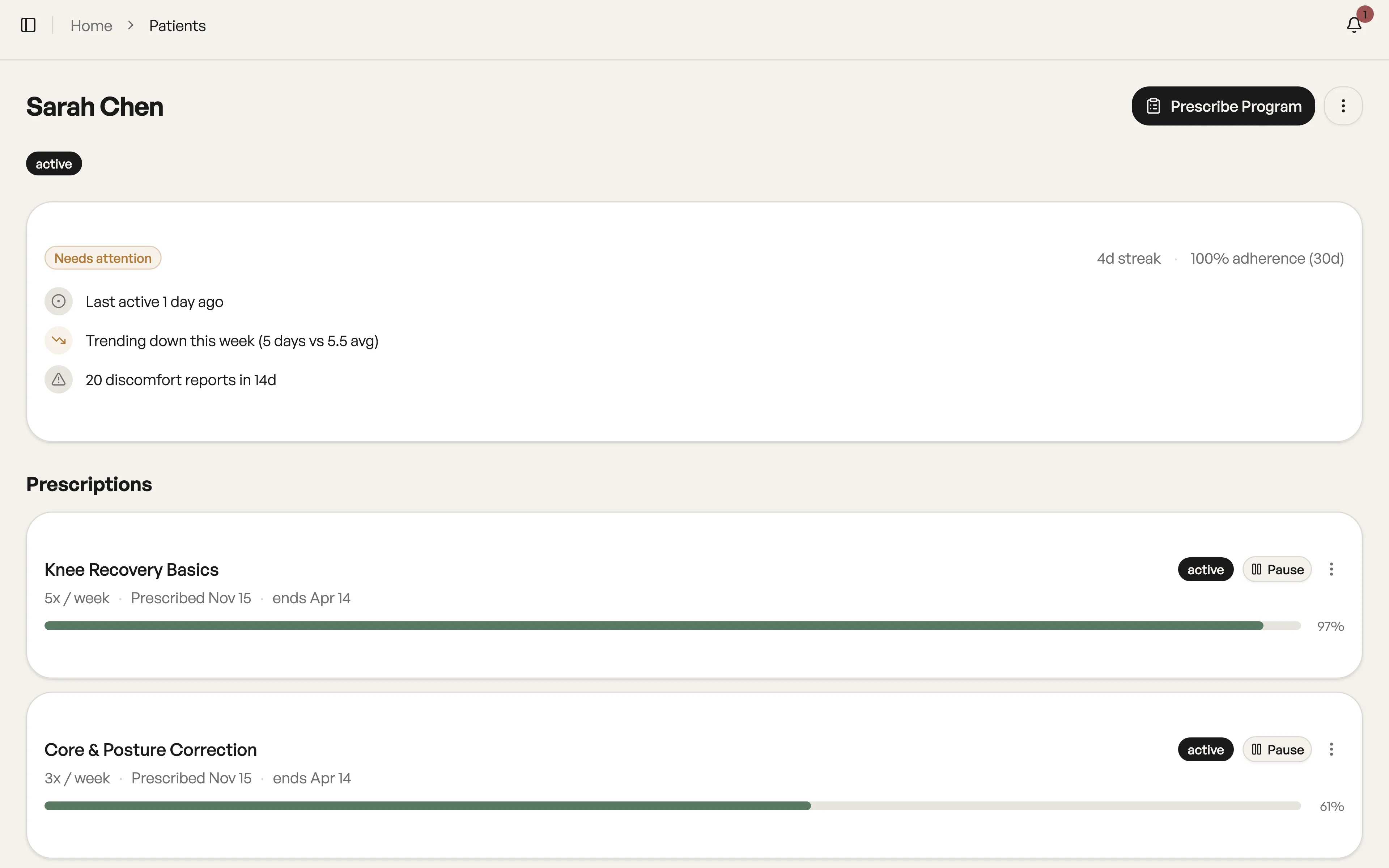 Patients see exactly what to do each day: video demos, sets, reps, and hold times in one simple view.